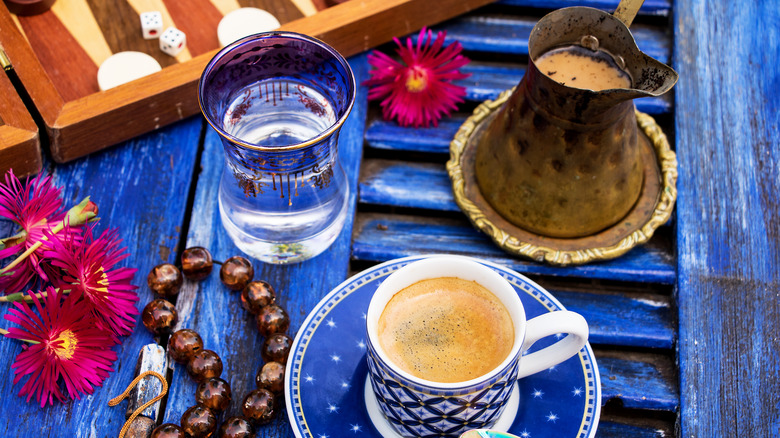 Greek coffee is set apart from other coffee varieties by several distinct characteristics. First of all, the coffee grounds are served in the cup. This may seem counterintuitive to Americans who associate coffee grounds with the sad dregs of an office coffee pot. But it's an essential aspect of Greek coffee culture — the drink is typically sipped very slowly, so the grounds will sink to the bottom and continue to infuse the beverage with flavorful coffee deliciousness.