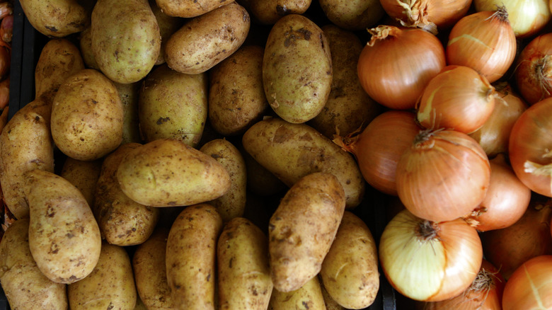 Potatoes are loaded with moisture. In fact, some tubers are about 80% water, which means that when they're stored in a closed environment, things tend to get very humid. Onions are prone to getting squishy and brown when they're exposed to too much moisture, so you'll drastically shorten their shelf life if you put them in a closed container with potatoes. Onions also release a lot of ethylene, which is a chemical responsible for ripening and maturation in fruits and vegetables. Exposure to ethylene will fast-forward potato spoilage and you'll be left with musty-smelling, mushy, unusable potatoes. These veggies both belong in the pantry, but they should be stored at least a few feet away from one another.
