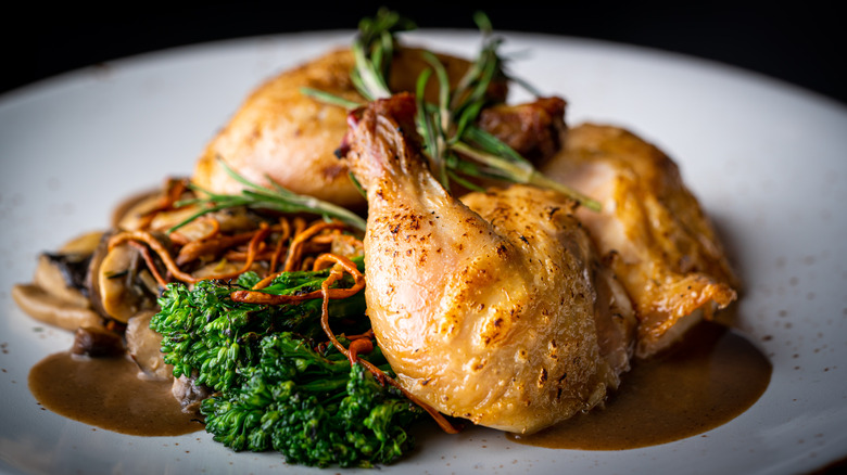 Red muscle fibers contain more fat and proteins than their white counterparts, so it's true that chicken legs and thighs are fattier and more caloric — more nutrient-dense, in general. Often, this has caused calorie-conscious people to opt for white meat. Pound for pound, there's some slight difference here: In addition to having less fat and fewer calories, light chicken meat also has a bit more protein than its darker counterparts. But, in truth, the differences aren't all that profound, and for its part, dark meat is richer in nutrients like iron, zinc, and vitamin C. Nutritionists have ended up going pretty easy on the whole question: A mix of dark and white meat chicken will help ensure you're getting the whole array of nutrients that your body needs. One more argument in favor of the whole roast chicken (which you can also use to baste your vegetables).