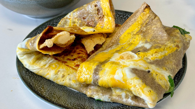 To take your scallion pancake game to the next level, try semi-homemade dan bing. This popular Taiwanese dish marries scallion batter with a thin layer of egg for a protein-packed flavor bomb. Traditional dan bing dough is chewy and flexible, making it easy to roll up. Trader Joe's scallion pancakes are comparatively sturdy so you won't get the same roll, but your groggy morning self will appreciate not having to make batter from scratch.