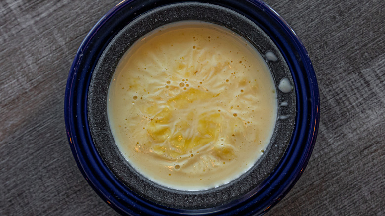 Even if you've followed all the instructions outlined here, there is no holding back the cruel ravages of time. Once you start to near the end of your queso's natural life, there are some signs you should look out for that will indicate its time is up. If you open the jar and immediately get a scent that something is off, like there is something foul lurking in your cheese dip — it should smell rich and cheesy — you're probably better off tossing it out. Likewise, if the taste is slightly off, too.