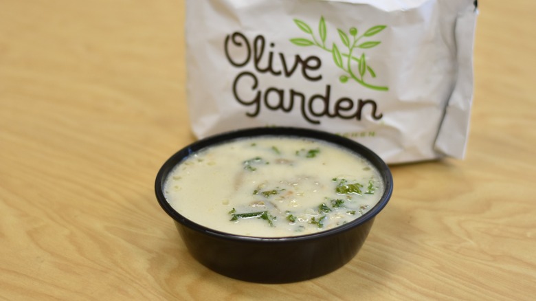 Originally from Tuscany, per its name, zuppa Toscana achieved fame among take-out patrons thanks to Olive Garden's version. The broth was a little bit thinner than the rich chicken and gnocchi recipe and considerably less buttery. It had the consistency of soup, rather than chowder, but a similar rich flavor. The zuppa Toscana had plenty of large potato chunks to give it some extra heft, making it our recommendation if you're ordering soup as a standalone meal. Additionally, the spicy Italian sausage in the zuppa Toscana soup gave it a little extra kick.