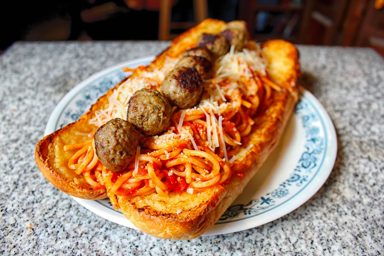 From the homemade foldovers made with leftover spaghetti and buttered bread, to the fancier piles of pasta and meatballs on garlic bread; from the crisp-fried antipodean jaffles or toasties filled with cheese and spaghetti bolognese, to the pastas of all shapes stuffed into hollowed-out torpedo rolls or bread cones gaining popularity in the Western United States—no matter how you serve them up, spaghetti sandwiches are a favorite way to reuse last night's dinner without need for plate or silverware, all over the English-speaking world.