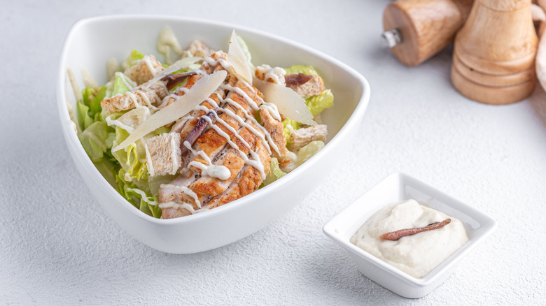 If you're unable to make it out to your favorite spot for lunch or dinner, you can take your ordinary bottled Caesar up a notch by adding anchovy paste. This small ingredient can make a big difference by bringing a briny, umami flavor to your dressing, much like what you'd find in a chef-made Caesar from the restaurant. Anchovy paste is crucial to unlocking that slightly fishy, salty, greasy goodness that you didn't know the dressing was missing. And you don't need much, by blending just a teaspoon or two into your bottled Caesar salad dressing, you can transform it from a bland afterthought into the star of your meal.