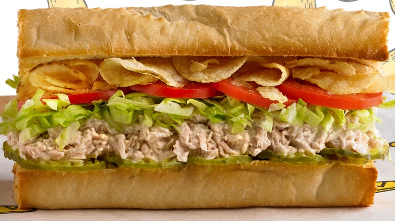There are a lot of mistakes you can make with canned tuna, and while there are many ways to punch up homemade tuna salad, perhaps with the sweet mix-in that it's been missing, it's sometimes too much trouble or just plain unappetizing to make a tuna salad sandwich at home and stink up your kitchen with all that fish and fishy water from the can. Fortunately, the United States' many major sub chain restaurants, all of which boast hundreds or even thousands of locations across the country (or regional sandwich chains we want to see everywhere) will happily and readily prepare a tuna salad sandwich for just a few bucks, made from specially developed proprietary recipes.