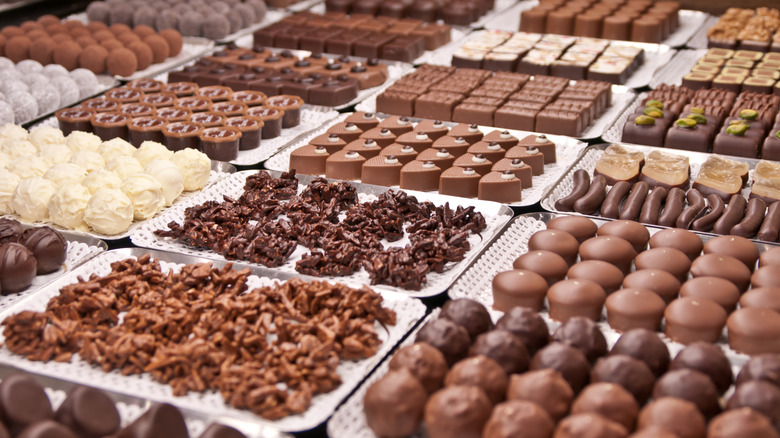 Truffles are often confused with their bite-size chocolate brethren, bonbons and pralines. Traditionally, a truffle is a small ball or sphere of chocolate ganache with some kind of coating such as cocoa powder, chopped nuts, or coconut. Chocolate bonbons look quite similar to truffles, but they're typically filled with fruit, liqueur, caramel, or other non-chocolate fillings instead of ganache and covered by a hard, molded chocolate shell. Pralines, in contrast, are more nut-forward and usually include a caramelized sugar and nut paste. However — and this is where it gets complex — all of these definitions are rather fluid and tend to be loosely applied, especially in the increasingly innovative world of gourmet chocolate.