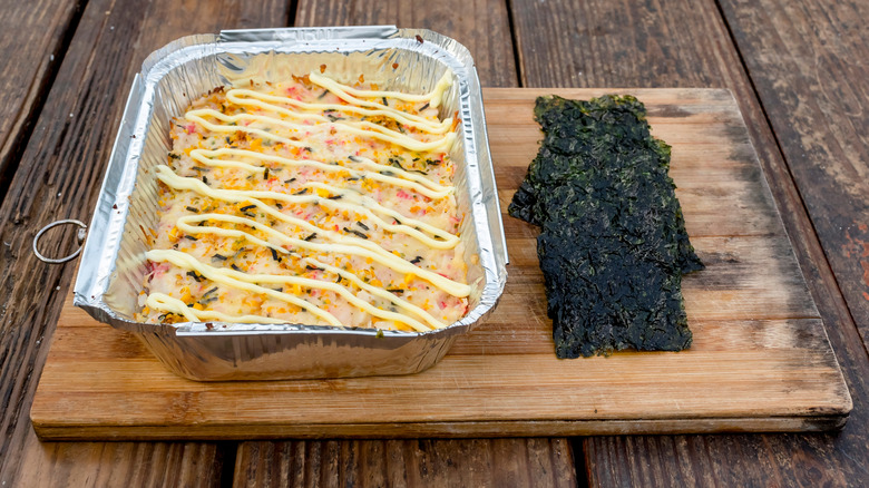 A sushi bake is essentially a casserole that begins with a layer of sushi rice seasoned with furikake, followed by a seafood topping. It's baked until golden, garnished with your choice of cucumber, avocado, furikake, green onions, and spicy mayo, and served on or with dried seaweed. The dish only recently became popular in the U.S. and is rooted in Hawaiian and Filipino cuisines, where dishes blending Japanese and other Asian flavors have long been part of the culinary landscape.