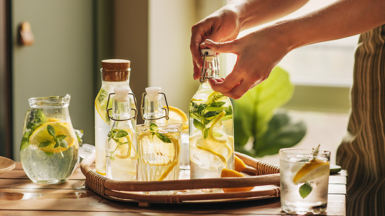To replicate this beloved recipe, you can combine freshly squeezed lemon juice, water, minced or chopped green chiles, black pepper, salt, and sugar in a jar or pitcher, sealing the mixture and placing it in the refrigerator for a couple hours so the ingredients can dissolve and infuse into the lemonade. This method may leave you with undissolved sugar at the base of your mixture though, as it's difficult to dissolve sugar in a chilled beverage, so you may find better results concocting a simple syrup by heating equal parts of water and sugar in a saucepan and waiting for the syrup to cool before adding it to your pitcher. Once thoroughly chilled and infused, feel free to strain the chile pieces from the lemonade or leave them in for a stronger kick, pour over ice, and enjoy.