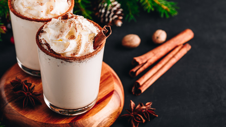 Eggnog is the quintessential holiday drink that everyone seems to have at least one glass of a year. It's a versatile treat — served with alcohol, homemade, store-bought, or even with bacon. The addition of bacon gives the drink a savory kick, plus it doubles as a tasty snack for when you're finished sipping. Just remember to check the expiration date on that eggnog, or you might end up with more than just a holiday hangover.