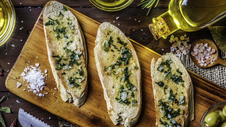 Restaurant garlic bread consists of more than just butter, bread, and garlic. Professional chefs mix olive oil into the butter used on garlic bread for two main reasons. First, the oil helps make the garlic butter more spreadable, to distribute the buttery mixture more easily. Perhaps more importantly, the oil keeps the butter from browning too quickly. That's because the milk solids in butter can burn quickly, whereas olive oil has a higher smoke point. By mixing butter with olive oil, restaurants can help keep the butter from burning — this is one of the essential tips you need when cooking with butter.