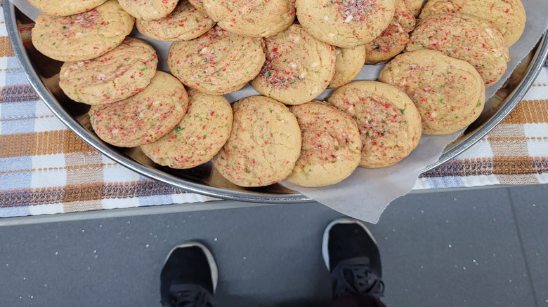 Crushed candy canes can be used to coat sugar cookies or you could bake a simple shortbread (our Walker's copycat recipe involves nothing more than sugar, butter, and flour) and dip all or part of the cookie in melted white chocolate before following up with a dunk in broken candy cane bits. Another easy idea involves stirring candy cane chunks into vanilla pudding or whipped cream and layering it with cookie crumbs to make a parfait. This same peppermint pudding could also be piled into a pie crust and topped with whipped cream (peppermint or plain) along with another sprinkling of candy crumbs.