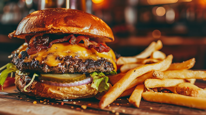 The chain's All American Cheeseburger is served with fries, and comes with lettuce, tomato, onions, and pickles, with a choice of Swiss, American or cheddar cheese. While the low price point for this burger is alluring, experiences shared by customers indicate that it's probably not worth it. One patron on Tripadvisor complained that their burger was "burnt to a crisp." Another customer on Tripadvisor posted a review titled "horrible burger," adding that despite their cheeseburger being "almost burnt," it couldn't be picked up from the plate due to a soggy bottom bun. Other reviewers on Yelp agreed, decrying it as the "worst burger" and stating they had better food at McDonald's and Burger King.