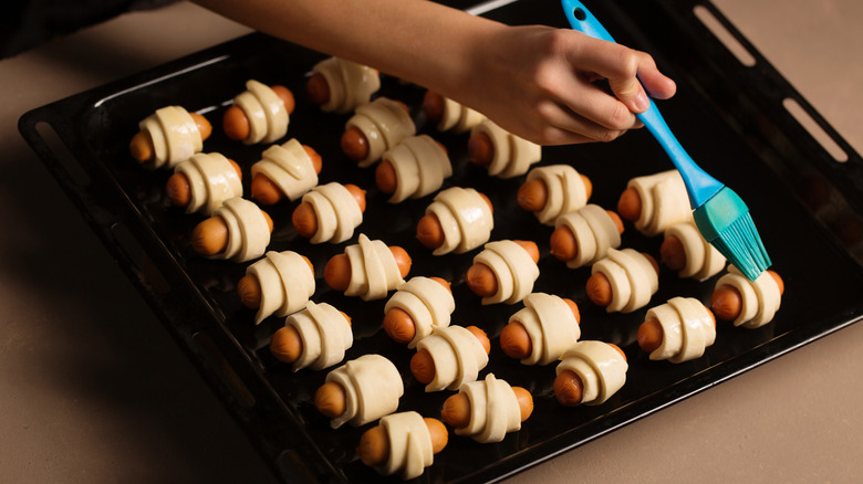 Pigs in a blanket are one of my favorite dishes to make for a potluck, and they're also the first thing I look for when canapés or appetizers are being served at a celebration. Arguably, it's one of the best ways to cook a hot dog, because there's nothing that awakens your taste buds quite like the combination of buttery, flaky pastry and the soft, juicy cocktail sausage. But getting the ratio of dough to filling is crucial for a satisfying bite — and a mouthful of just pastry kind of sucks. So here's how to cut your crescent rolls for perfect pigs in a blanket.