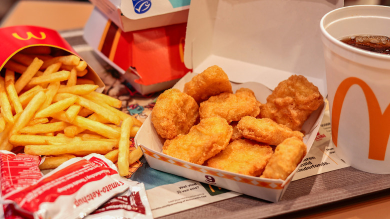 Another McDonald's fry hack runs along the same lines as the now-famous Chick-fil-A bowl order, which an employee shared on TikTok and involved mixing several Chick-fil-A items in a plastic tub, shaking to combine them. In the McDonald's version, TikTok user sarahmargareteats mixes chicken nuggets and fries with BBQ, buffalo, and sweet and sour sauce in a nugget box and shakes it until the sauces and items mix, giving almost poutine-esque results. Just a head's up: While the result is delicious, this hack is probably too messy for on-the-go dining.