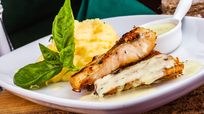 First off, we're not dunking on your comfort meal of tuna melts and big glasses of milk. When it comes to choosing what to drink with fish at a restaurant, however, Alfredo Nogueira puts it pretty plainly, "Milk is always a bad choice." Aside from looking a bit like a child, you'll also get a lot more out of the fish you've paid good money for by pairing it with a drink that aptly complements its flavors. Milk can overpower fishes like halibut or cod, and it tends to linger in the back of your mouth. If you must satisfy that dairy craving, go for salty, dry cheeses like feta crumbles or a Parmesan crust. Even an herby tzatziki sauce would work.