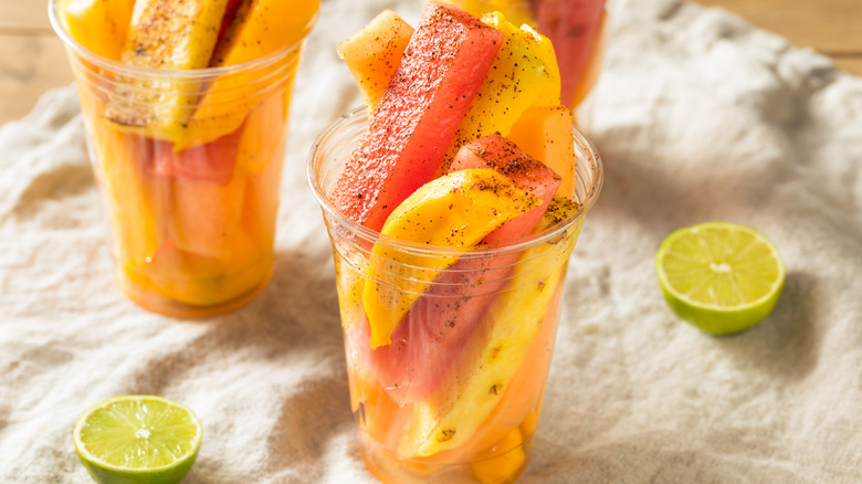 To prepare this snack, make sure you start with cantaloupe that's ready to eat. The best way to choose a ripe cantaloupe at the store is to make sure it's firm without being too hard and doesn't have any substantial soft spots. Once you've got your cantaloupe, cut it however you see fit. The trick of cutting your watermelon like fries can also be applied to cantaloupe for a fun bite to eat. Once it's cut, grind some black pepper over the top to enhance the sweetness of the melon while adding a bit of zest to each bite. Make sure to use fresh ground pepper for the best results. For a snack that feels like a warm, sunny day, drizzle some honey and add a small amount of Tajín chile lime seasoning to the cantaloupe as well.