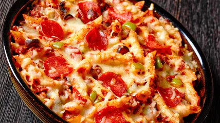 Pizza casserole is something you don't even really need a recipe for. Start with a base of cooked pasta, preferably a short, chunky kind like rigatoni, ziti, or shells. Broken lasagna noodles will also work. In fact, you can also use raw pasta, as long as you compensate by adding extra liquid that will be absorbed as the casserole bakes and covering the dish so the liquid soaks into the noodles instead of evaporating. Mix the pasta with pizza sauce, along with any cooked, crumbled meats and sauteed vegetables you choose to add. Stir in some shredded mozzarella for an even more pizza-like experience. Bake the casserole for about half an hour until it's heated through and the noodles (if you've used uncooked ones) are soft.
