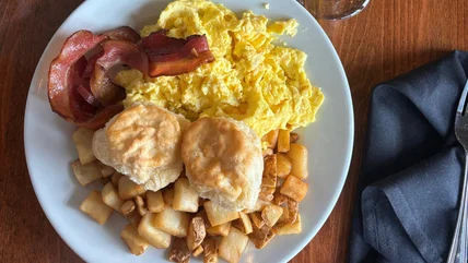 Just like he built his Frankensteined Cadillac in "One Piece at a Time," he built the breakfast platter with bologna, eggs, two biscuits, and fresh slices of tomato. The biscuits were served with butter and eaten with local honey and he added ketchup to the eggs — because, yes, ketchup does belong on eggs.