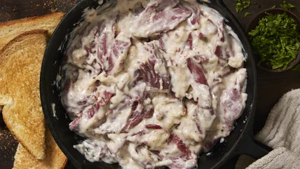 Because chipped beef is often served creamed anyway, dip is a pretty logical next step in terms of use cases. The meat, dried and sliced into small pieces resembling corned beef, is mixed with a dairy-based product, such as cream cheese or sour cream (or a combination of both). Add in whatever kind of seasoning you like — garlic powder, Worcestershire sauce, maybe even some chives chopped a la Thomas Keller — and throw it in the oven or a slow cooker for a while. That's all you really need for something rich, hearty, and utterly comforting.