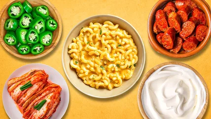 You can get creative with the dish, either folding the kimchi into the finished mac and cheese, or laying it on top as a crunchy, tangy topping. The sourness and acidity of the kimchi will tame some of the mac and cheese's richness, and give the dish the contrast of flavors and texture that we all crave. To continue with the Asian-inspired theme of the dish, sprinkle some toasted sesame seeds or sliced green onions over the top.
