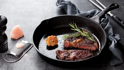 Then, the extra time in the refrigerator will allow the surface to dry. That'll make all the difference before you sear it. If you want to add a final layer of flavor, you can fat flash the steak using some aromatics like garlic and fresh green herbs such as thyme or rosemary.