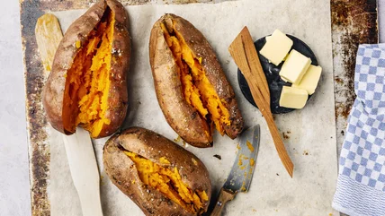 Roast your spuds until caramelized (save yourself the misery of dry sweet potatoes with this easy foil trick), slice them open lengthwise to expose the flesh, and then drizzle your favorite store-bought or homemade hot honey over them. The drizzle clings to those crisp edges and pools into the soft orange flesh, creating the glossy, sticky finish that makes them taste twice as rich for double the flavor payoff.