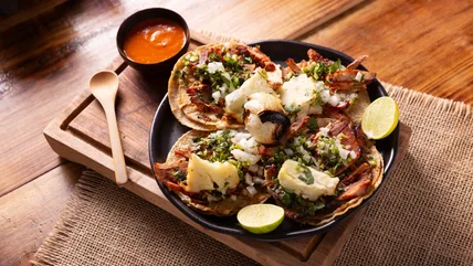 When it's ready, your pastor should be caramelized and perhaps even a little charred on the outside. Remember to properly check the internal temperature of the pork with a meat thermometer, and, if grilling, keep the cooking temperature consistent using a grill thermometer. Once cooked, rest the meat for a few minutes before thinly slicing down the edge of your trompo to create shavings of meat, and tossing them in the juices collected in your pan. Traditionally, pastor is served in corn tortillas along with some slices of the pineapple that topped the trompo, diced cilantro, diced raw white onion, and a squeeze of lime.