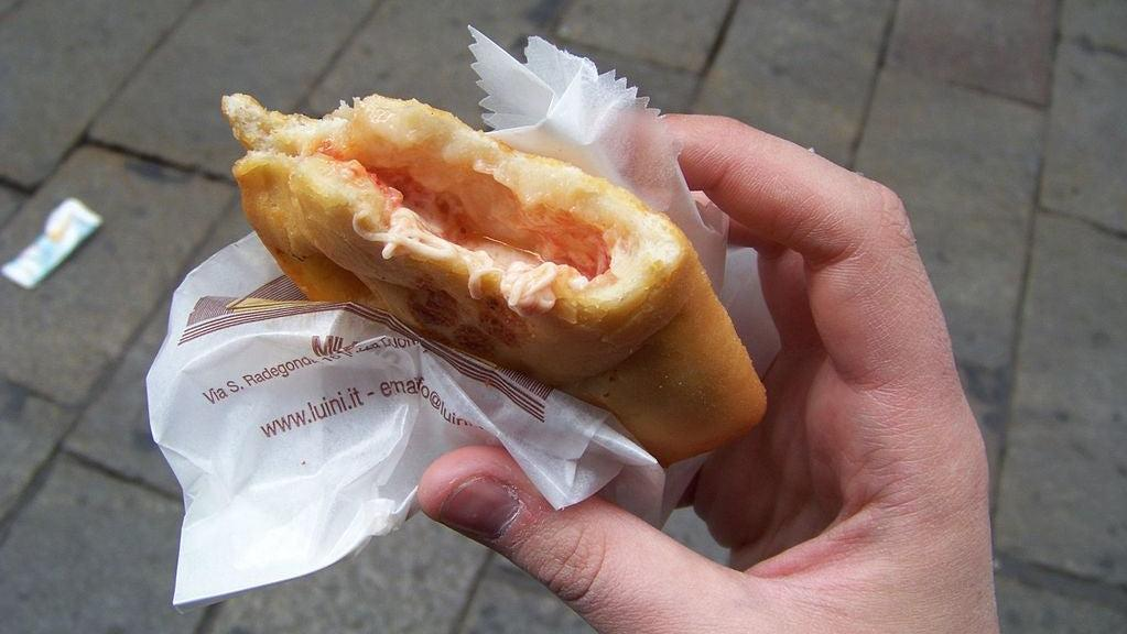 Don't mistake a panzerotto (plural: panzerotti) for a calzone, because they're different beasts altogether. Panzerotti almost always have one key delicious factor distinguishing them from calzones: they're fried. You can expect panzerotti to be filled with tomato sauce, mozzarella, and any assorted fillings of your choice, and they're also usually small enough to carry around by hand, which makes for good street food—just don't burn your tongue on the fillings.