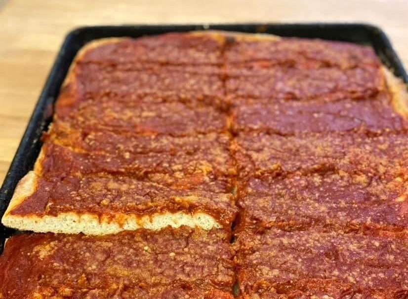 The term "tavern cut" refers to the fact that this style originated in bars. It was served for free to encourage patrons to keep drinking instead of leaving the tavern to go find food. Smaller pieces were easier to dole out as a snack, so the pizza was cut into squares, as it remains today. An advanced move is to ask for the pizza "well-done"; you'll get a deeper caramelization on the cheese, plus a crisper crust.