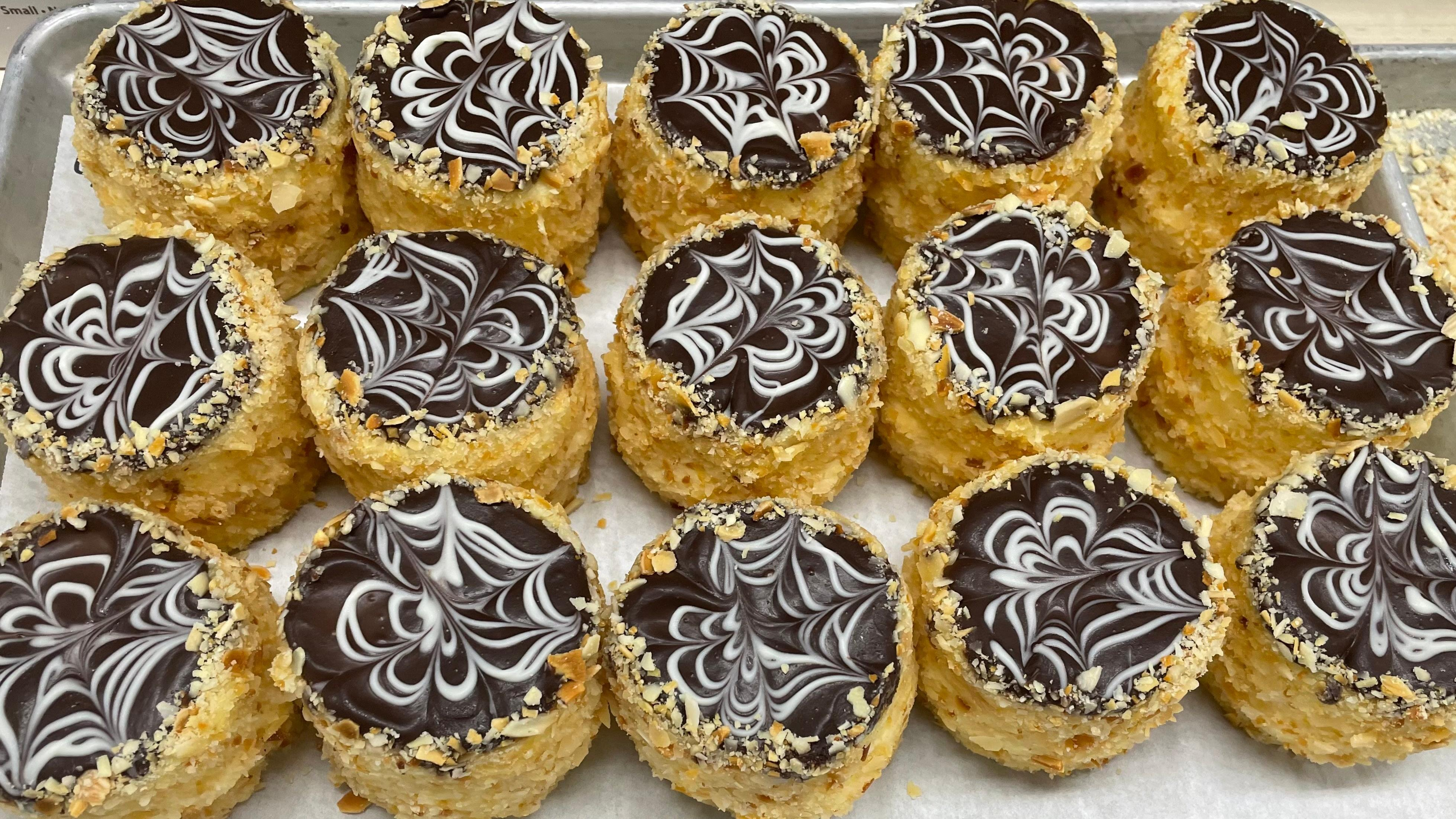 Chef Anezin is long gone, but today, pastry chef Laura Boyd-Figueroa helms the subterranean kitchen, where she bakes, blends, and tempers the primary ingredients before cutting, frosting, spreading, and encrusting some 200 mini versions of the signature cake each weekday. On weekends the hotel sells around double that. Then there are the full-sized 8" Boston cream pies that require the use of a turntable so the custard and ganache can be evenly spread. Boyd-Figueroa invited both my grade-school son and me into the kitchen to see how each cake is prepped. As we soon found out, it's harder than it looks.