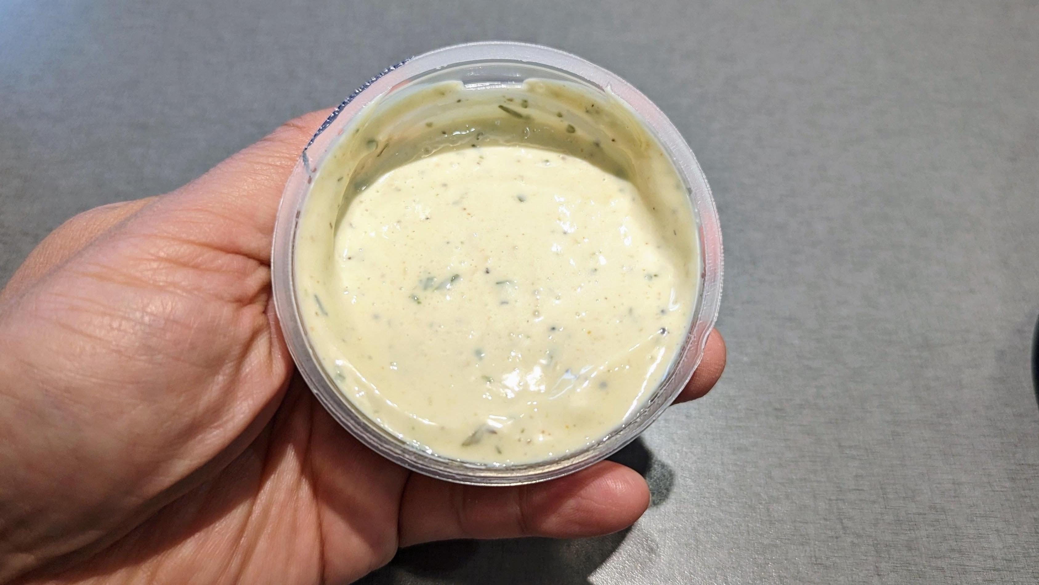 The sauce comes in pre-packaged 2-oz. tubs (indicating, of course, that it's not made on site), and it does indeed look like ranch dressing. It's creamy and flecked with herbs, a slight off-white color.