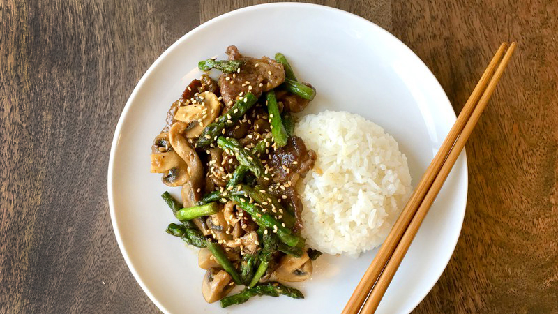 3. Add the asparagus to the hot pan. Sauté for a minute, then add the mushrooms, ideally cut-side down, and minced garlic. Again, let the vegetables sit untouched in the pan to develop a golden-brown crust. Then add the beef back into the hot pan and stir-fry everything for another minute.