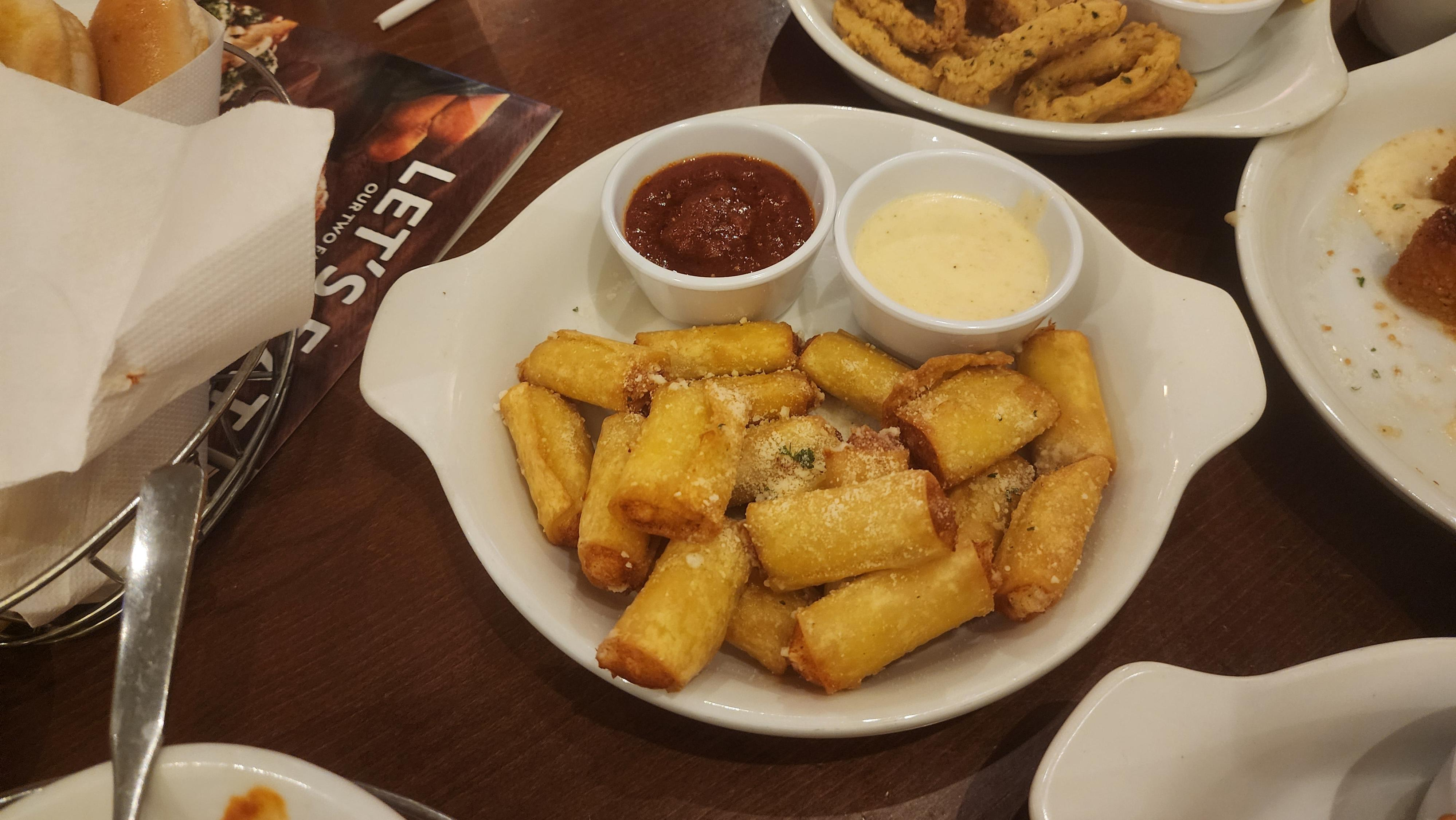The fried mozzarella rectangles at Olive Garden commit the cardinal sin of being soft and limp. While you do get an awesome cheese pull, the cheese is exceptionally bland and tastes vaguely of plastic. The breading here, as with the calamari, is oversalted, and the overall dish is undercooked. Many of Olive Garden's appetizers simply need to be fried longer. It could be the specific location I visited, but surely every fryer is on a timer; restaurants like this have to be operate mechanically to be successful. So what gives? Some Olive Garden appetizers arrive perfectly crunchy and crispy. Not the fried mozzarella, though. Stay away. I'd rather be at TGI Fridays.