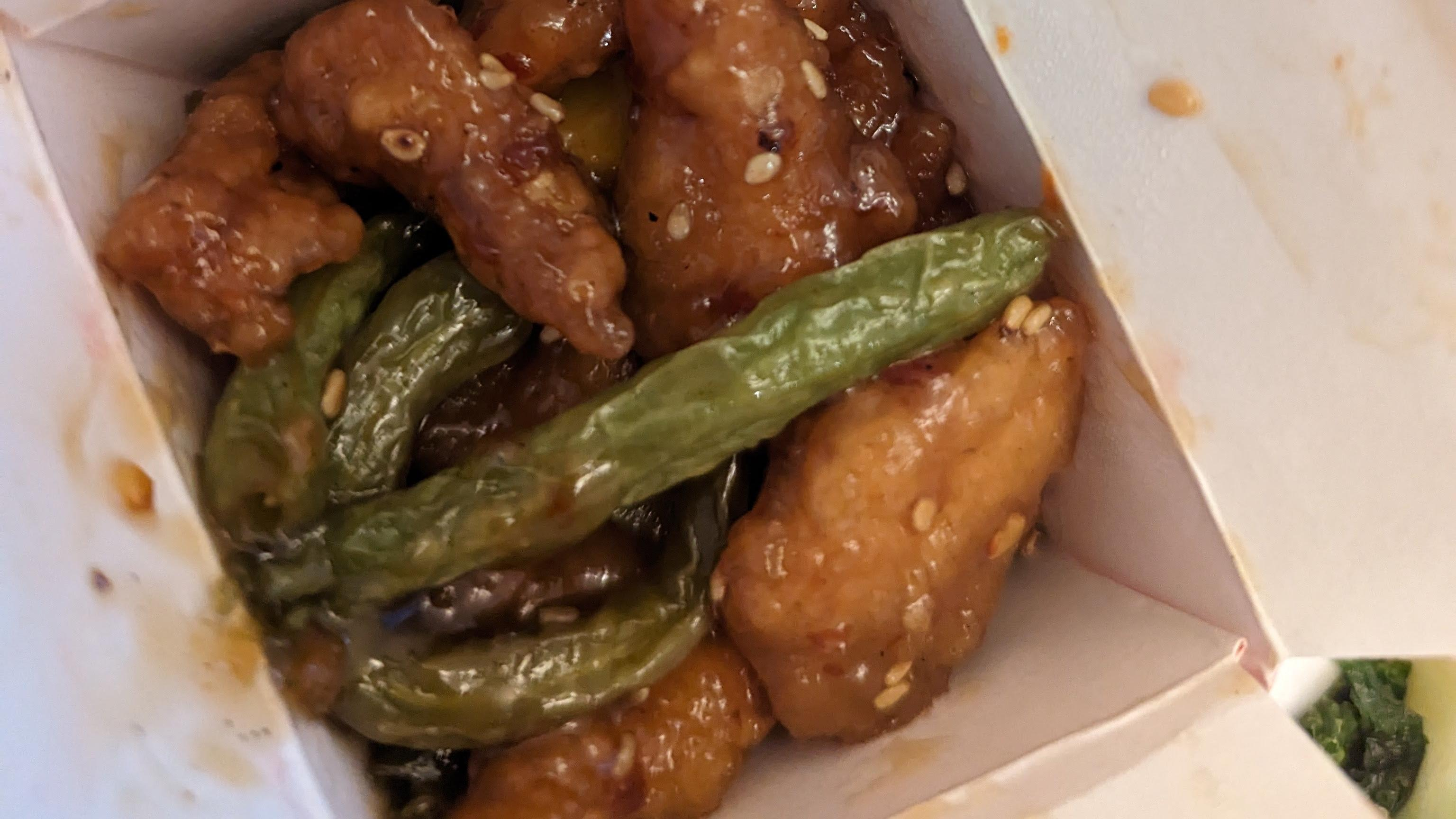 Reheating helps thin it out a bit, but it's a step you shouldn't have to take. And where Panda gained points for enhancing this takeout classic with zucchini, it loses an equal amount for using breaded dark meat. Dark meat makes sense, since it's meant to be earthy. But why is it breaded? This added a confusing textural element and even more filler to a sauce already gloopy with too much.