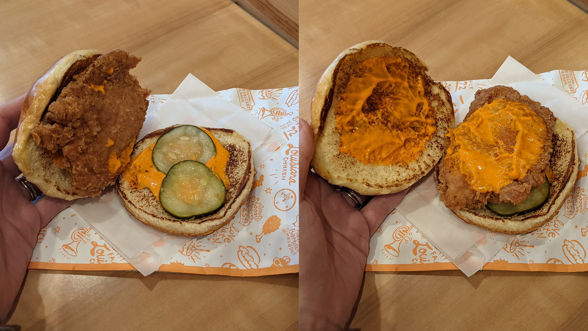 Despite the flecks of herbs visible in the sauce, the tangy, herbaceous ranch notes could have been stepped up a bit in this combo sauce. The buffalo half of this duo is doing exactly what it should: offering sharp little pops of mild-to-medium heat that die down when you hit the chicken but show up again after each bite is through, lingering in that same way that makes eating buffalo wings so satisfying. Yet the only time I could identify any ranchiness was when I licked the sauce right off the bun. At least for a while. Oddly, about 20 minutes after finishing the sandwich, once the mild but persistent heat of the buffalo flavor had left my palate, those oniony ranch notes I'd been seeking slowly made themselves known, blooming on my palate as an aftertaste. Unfortunately, 20 minutes after I eat something is not the ideal time to taste it.