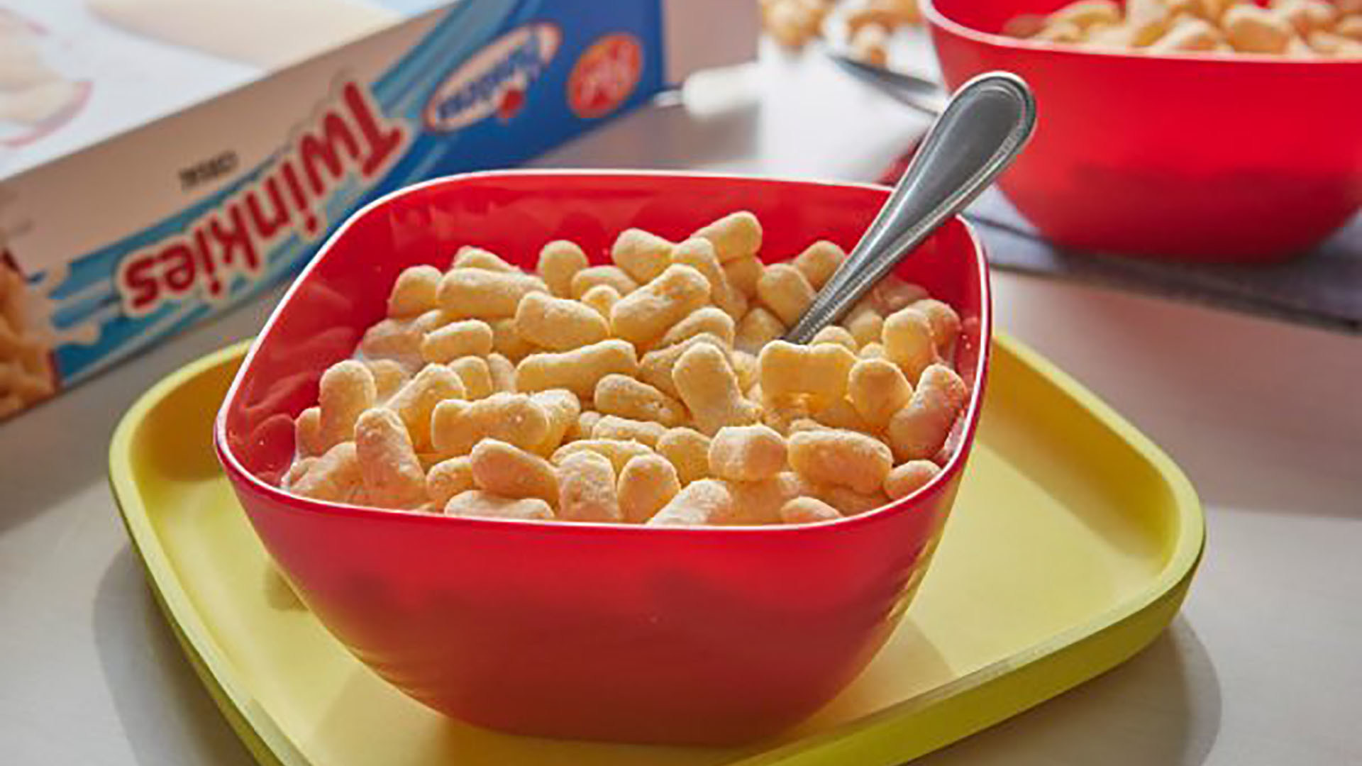 According to a press release issued by Post Consumer Brands, "Twinkies Cereal replicates the distinctive taste and familiar oblong shape of the golden-colored snack cake, delivering delightful sweetness in every bite." There is no mention of any creamy filling inside these oblong nuggets, so perhaps they're meant to be eaten with frosting instead of milk? I've done much weirder things with cereal.
