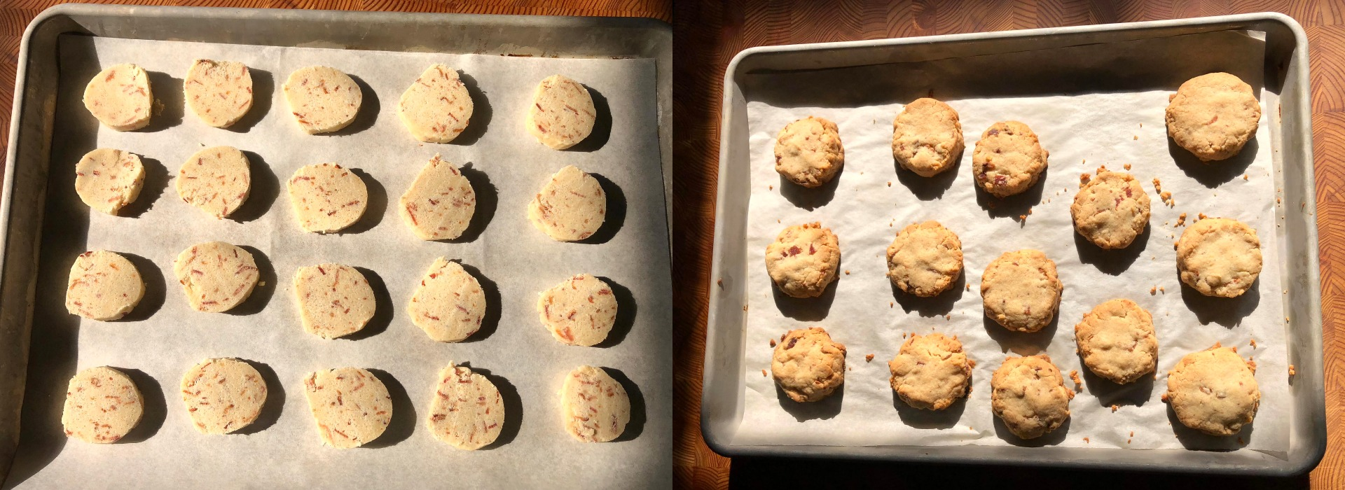 This crispy cookie, with its little pops of salt and meat and heat, is equally at home on your cheese board as it is on your dessert plate. Slightly less sweet than traditional all-butter shortbread, with the addition of ground white pepper to balance the salt, plus chopped crispy bacon bits threaded through, it makes for a sweet cracker that cries out for a soft creamy cheese like goat cheese or brie or Boursin. But it also hits that salt-sweet vibe that makes chocolate covered pretzels and salted caramel so delicious, and can stand up to a dunk in dark chocolate or a maple glaze. It is a perfect pairing for ice cream, especially vanilla, caramel, or coffee. And if you want to win this year's holiday cookie swap, sandwich them with cajeta or a bittersweet chocolate ganache.