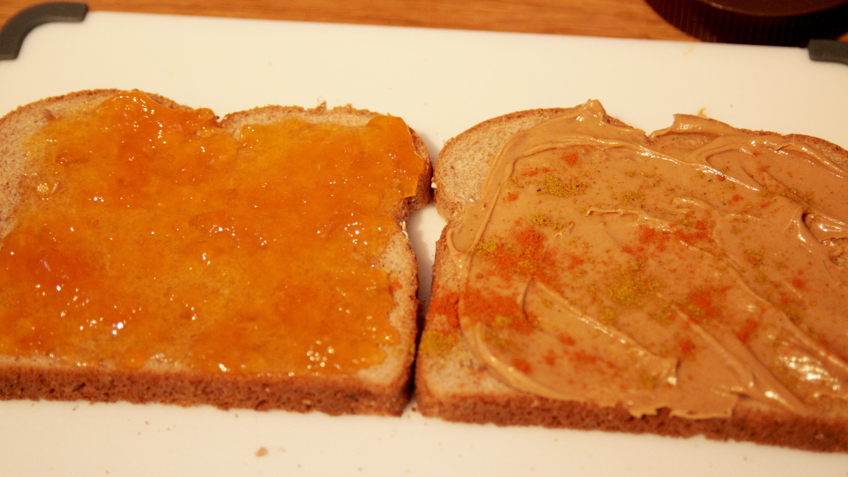 Now that I look at the above photo I realize I'd forgotten the black pepper. Crap. I'm sorry, discontentfern, for this grave oversight. However, I am going to say, this was a really fantastic peanut butter and jelly sandwich. I was not expecting this to be so good. The curry powder is what stood out to me most; it played very well with the peanut butter and apricot jam by coming out at the end in a complex way I wasn't expecting. The cayenne added lingering heat, and if I'd added the black pepper I know there'd be an instant bite to it. I highly recommend this.